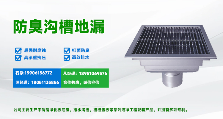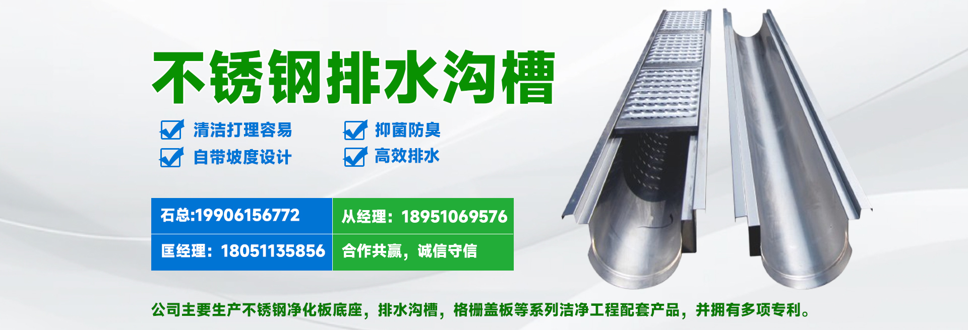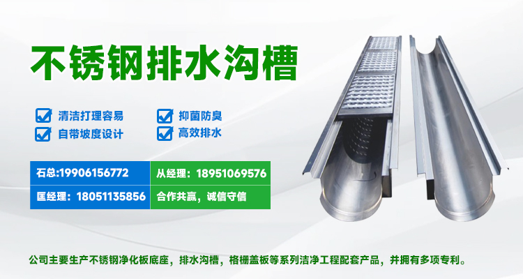公司产品:不锈钢地沟槽、不锈钢盖板、不锈钢地沟槽是公司发明产品,公司拥有多项证书,模具化生产,组装式安装,适用于食品厂,园林景观,厨房设备等领域。不锈钢地沟盖板有普通不锈钢盖板,承压盖板, 缝隙式盖板。配套地沟槽使用。